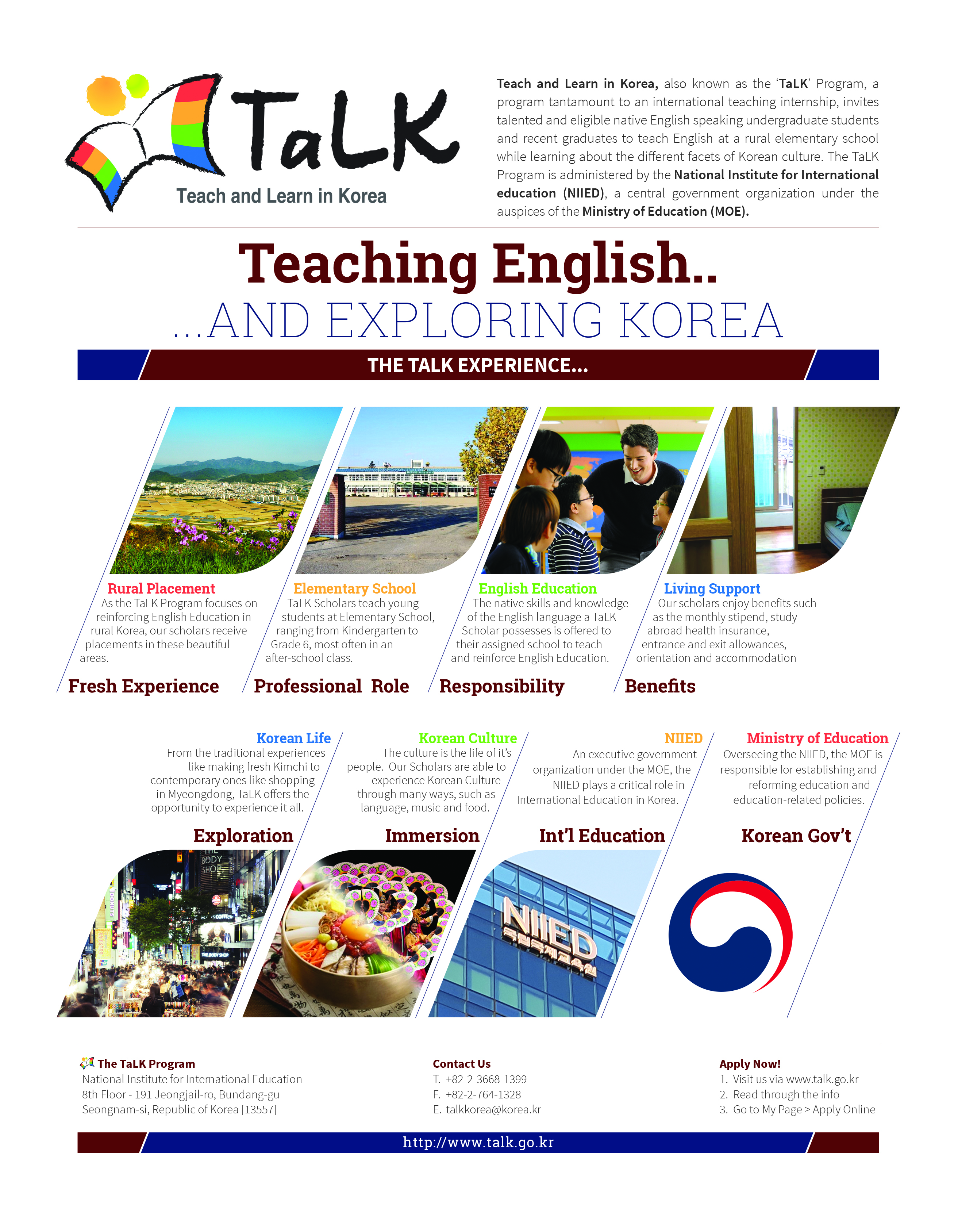TaLK is a service-learning scholarship program for undergraduates seeking to learn about Korea and gain experience abroad. There is ample time to explore personal interests and more opportunities to travel around Korea through TaLK!.