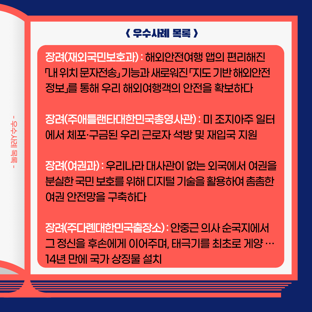 2025년 제2차 외교부 적극행정 우수사례 공모전을 통해 선발된 우수사례 7건을 소개합니다.