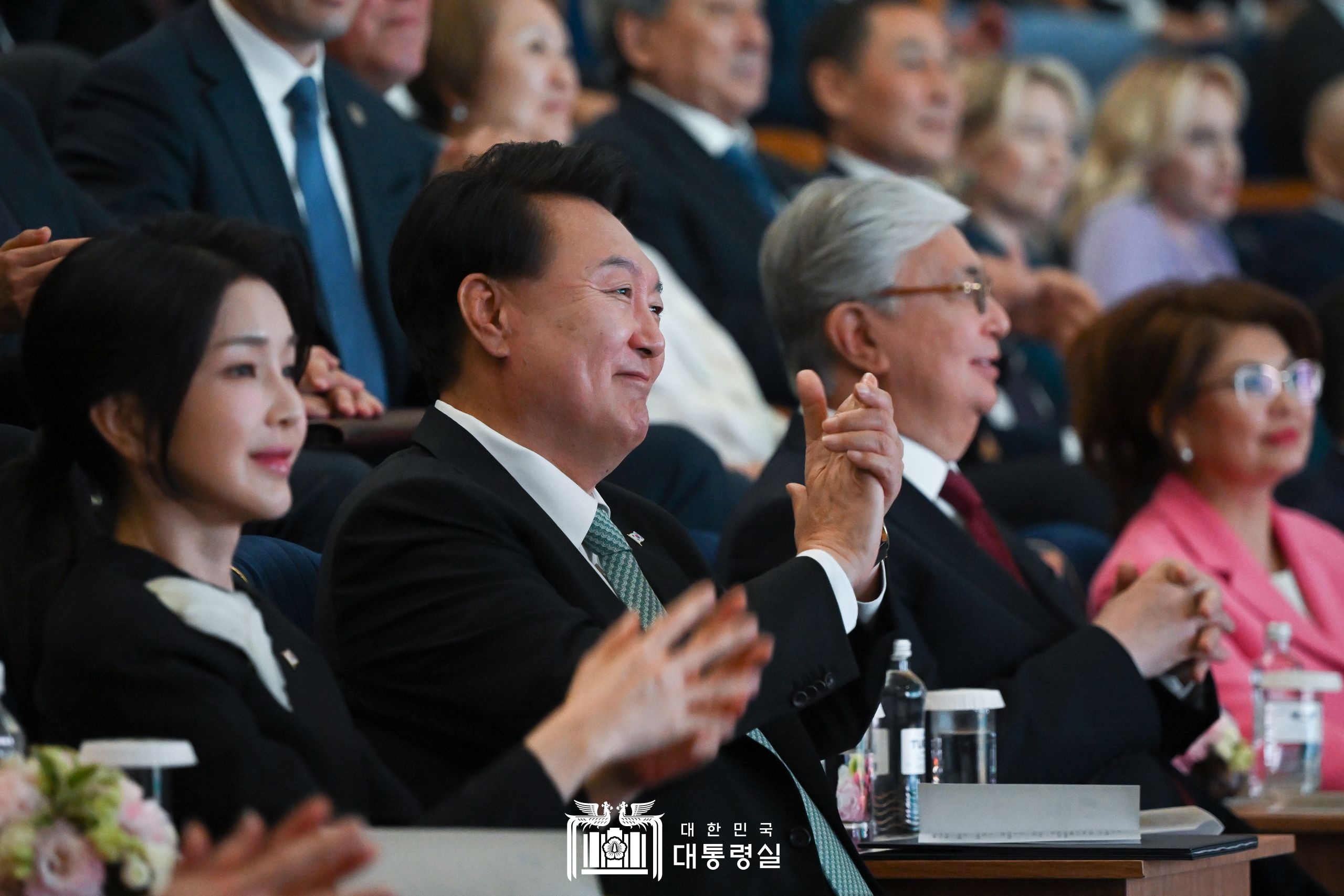 윤석열 대통령 부부는 오늘(현지 시각 6. 12, 수) 오후 카자흐스탄 아스타나 드라마극장에서 열린 ‘한-카자흐스탄 문화공연’에 참석해 양국의 정상급 예술인들과 고려인이 빚어낸 화합의 공연을 관람했습니다.