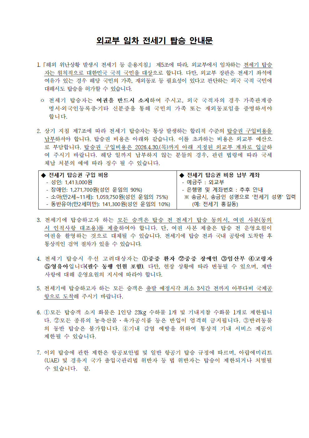 우리 정부는 귀국에 불편을 겪고 계신 우리 국민을 지원하기 위한 에티하드항공 전세기(아부다비→인천)를 아래와 같이 운항하고자 준비하고 있습니다.